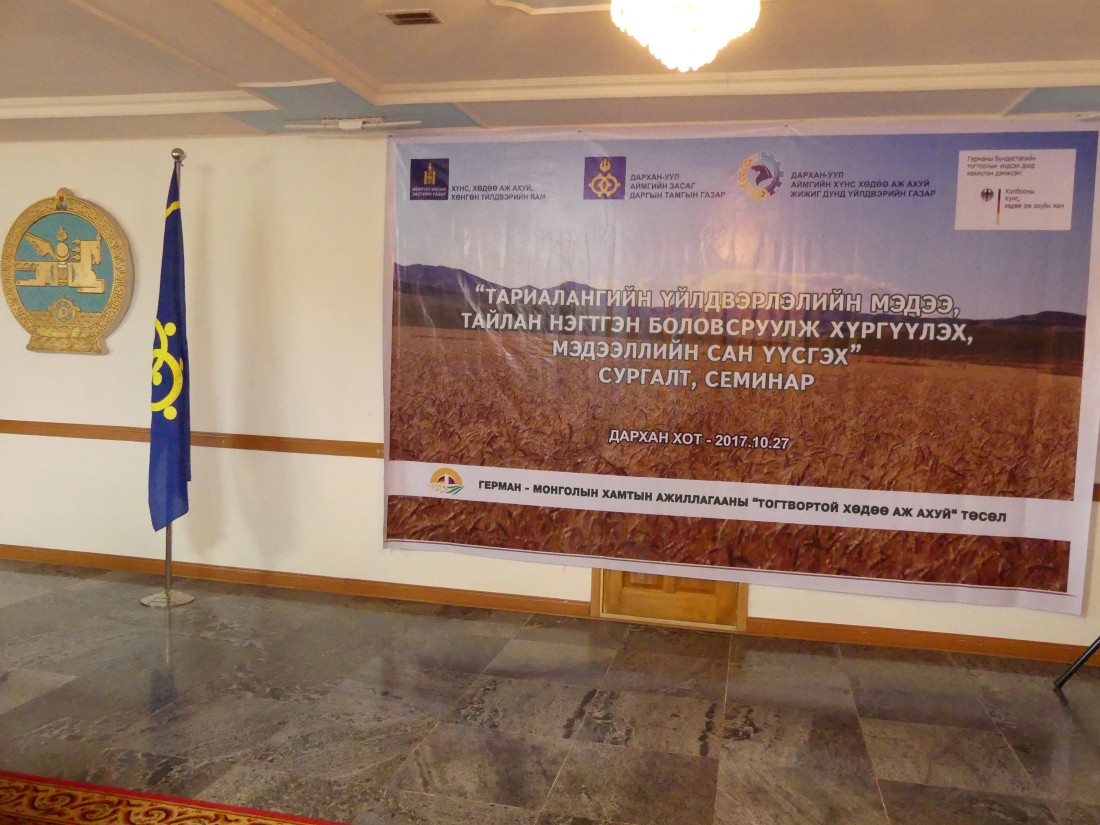 Das Deutsch-Mongolische Kooperationsprojekt “Nachhaltige Landwirtschaft“ veranstaltete am 27.10.2017 in Kooperation mit dem Ministerium für Ernährung, Landwirtschaft und Leichtindustrie und der Provinzverwaltung des Aimags Darkhan-Uul ein Seminar unter dem Thema „Erfassung und Verwaltung der ackerbaulichen Daten, Erstellung einer umfassenden Datenbank“ in Darkhan.